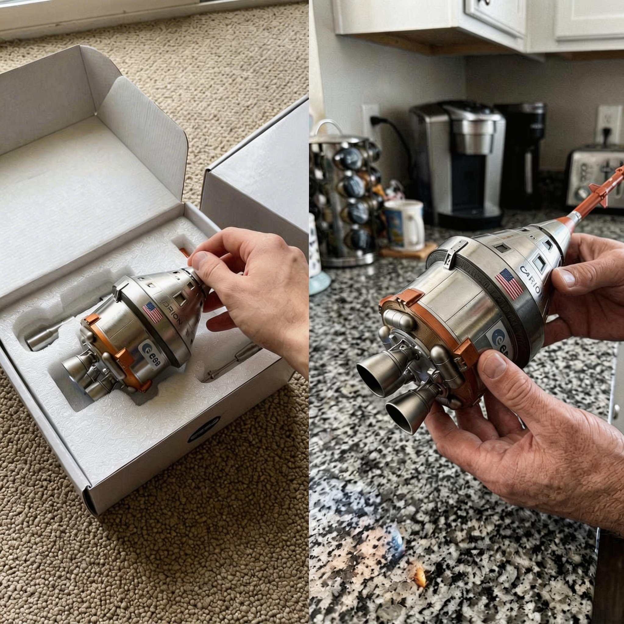 🥰The spacecraft is mounted on a premium crystal-clear acrylic base with a built-in “breathe-light” system that emits a soft, glowing light from below, simulating the glow of re-entry or propulsion. A matching informational plaque identifies it as the Orion MPCV – Titanium & Aluminum Precision Model featuring Propulsion & Breathe-Light Base.